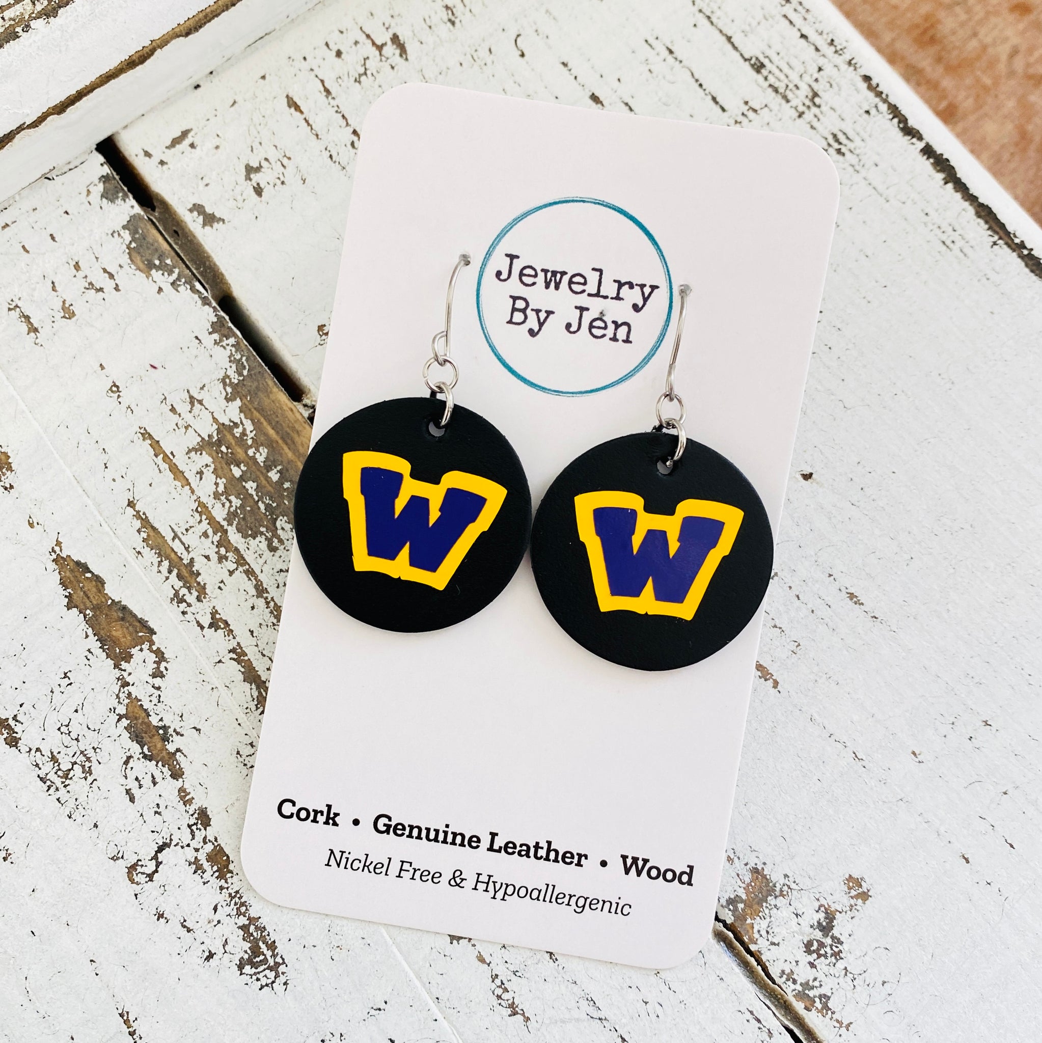 Genuine Leather with layered vinyl "W" logo Measures about 1.00” from the hook. Stainless steel hook Nickel free and hypoallergenic Due to display settings on your device, colors may appear different